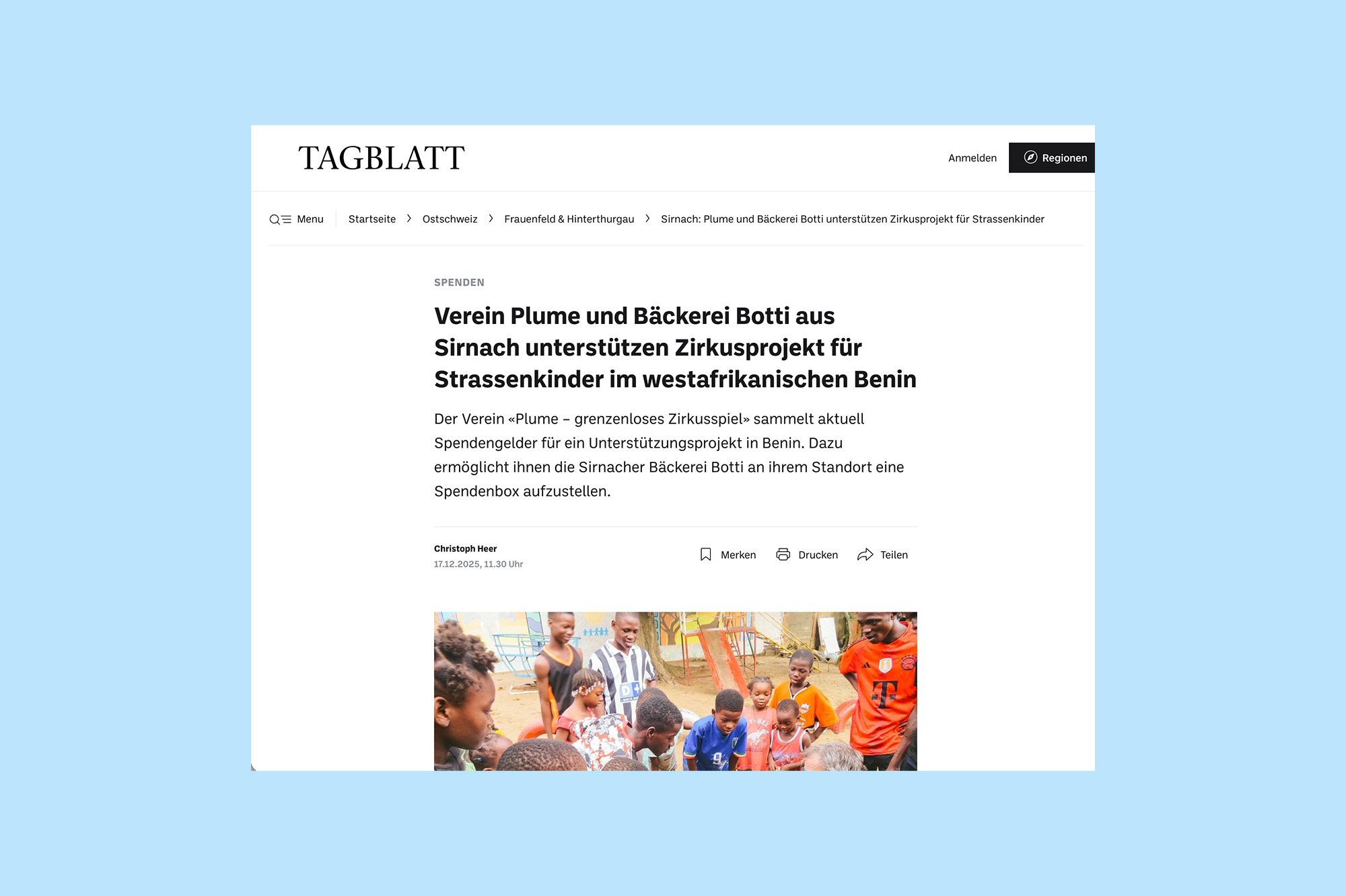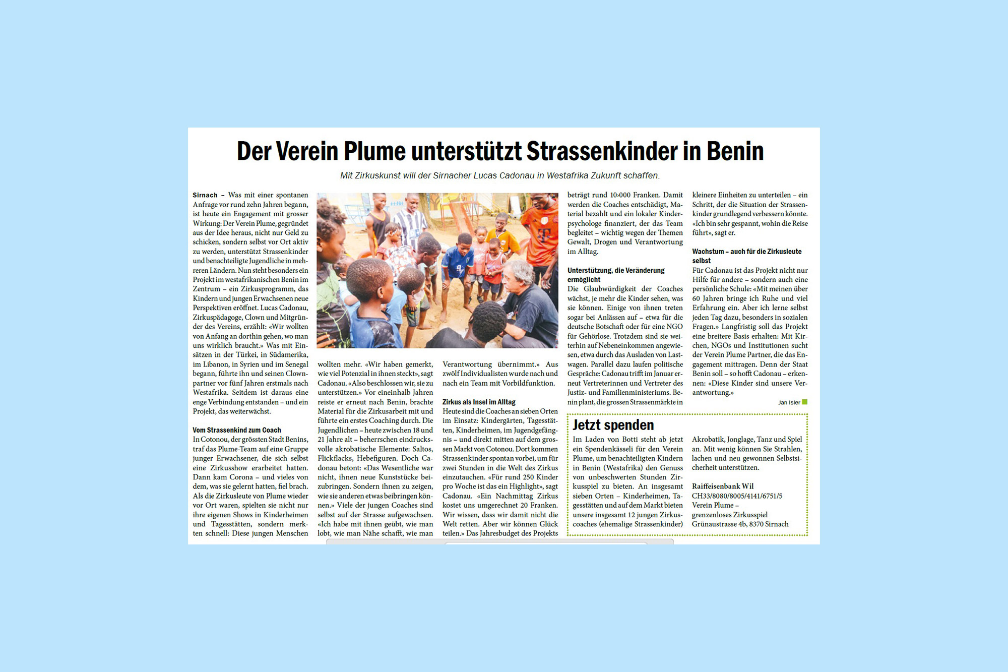 Der Verein «Plume – grenzenloses Zirkusspiel» sammelt aktuell Spendengelder für ein Unterstützungsprojekt in Benin. Dazu ermöglicht ihnen die Sirnacher Bäckerei Botti an ihrem Standort eine Spendenbox aufzustellen.